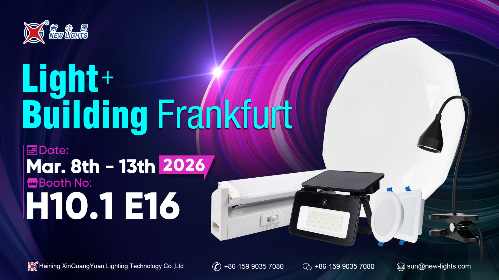Haining Xin Guang Yuan Lighting Technology Co., Ltd wird an der internationalen Beleuchtungsausstellung in Frankfurt, Deutschland, teilnehmen 8. März bis 13. März 2026 . Das Unternehmen wird auf der ausstellen Stand H10.1 E16 . Während der Ausstellung wird Haining Xin Guang Yuan Lighting Technology Co., Ltd seine neuesten Beleuchtungstechnologien und Produktlösungen vorstellen und sich intensiv mit Branchenexperten und Partnern aus der ganzen Welt austauschen. Besucher sind herzlich willkommen, für Gespräche und Kooperationsmöglichkeiten am Stand vorbeizuschauen.